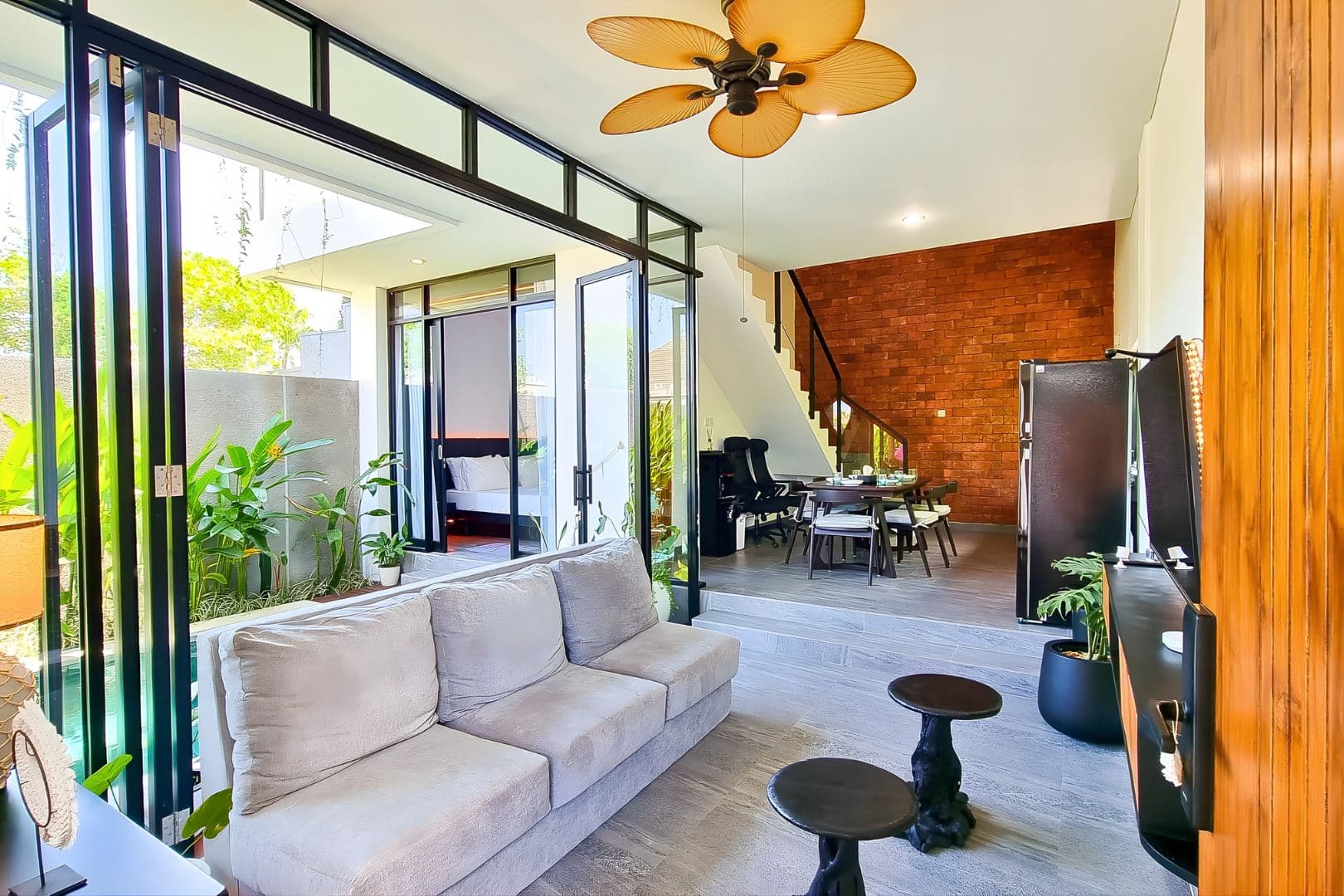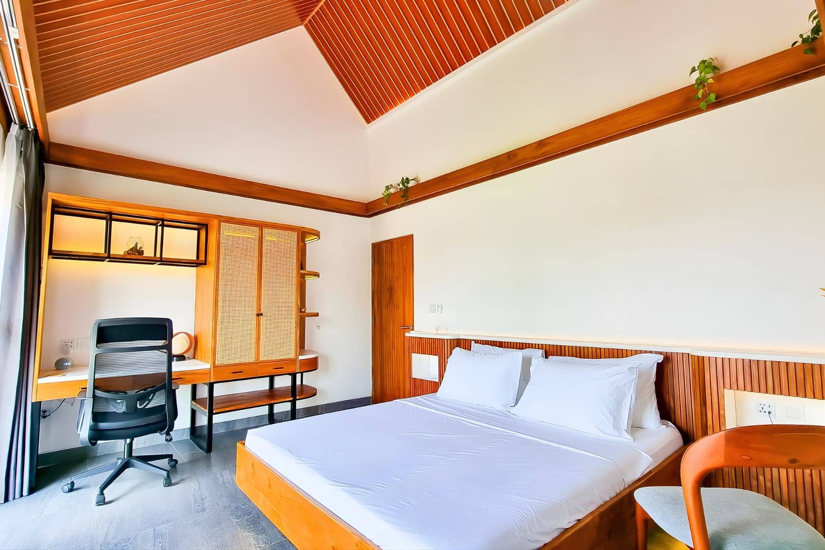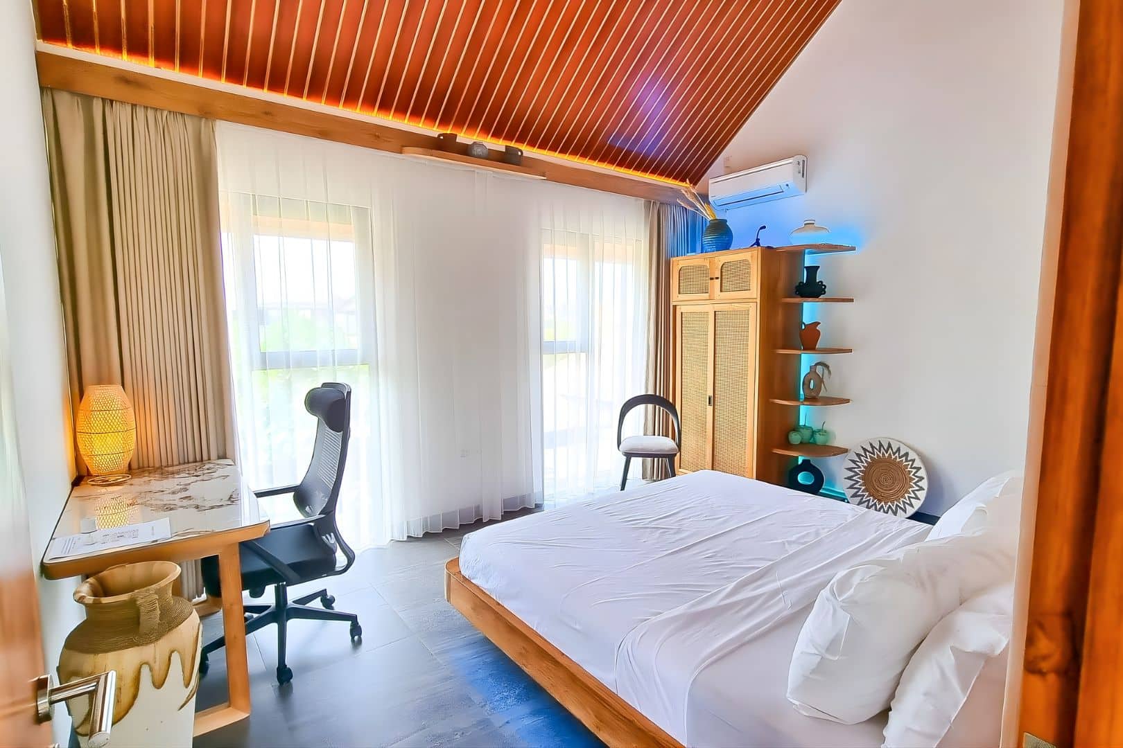 Each bedroom comes with its own ensuite bathroom, while the enclosed, air-conditioned living space ensures comfort all day long. Built with remote work in mind, the villa features four ergonomic workstations, two large LCD monitors, and smart home integration powered by Alexa control lights, AC, and curtains with just your voice. When it’s time to unwind, enjoy access to 11,000+ international channels, including sports and entertainment.
